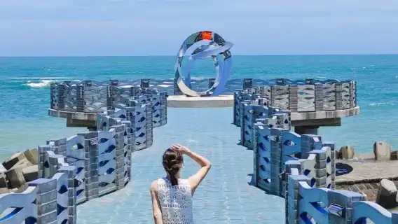 석양이 지는 단수이 홍마오청과 팔리 강변의 경치를 감상하며, 예술과 자연이 어우러진 여유로운 분위기를 경험해 보세요.