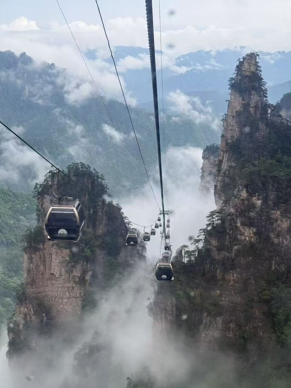 ▲ 톈쯔산 케이블카는 단일 순환식 탈착형 케이블 승객 로프웨이입니다. 모든 장비는 오스트리아 도펠마이어(Doppelmayr) 사에서 수입했습니다. 톈쯔산 케이블카의 완공은 우링위안 관광지의 교통 환경을 크게 개선했을 뿐만 아니라, 천자산 관광지에서 단 한 번의 전망을 보기 위해 반나절을 소비해야 했던 관광객들의 아쉬움을 해소해주었습니다. 편안하고 안전한 톈쯔산 케이블카를 타면 노선을 따라 펼쳐지는 아름다운 풍경을 즐길 수 있어 경이롭기 그지없습니다. 특히 구름이 감도는 날에는 케이블카 위에서 선녀가 날아다니는 듯한 생동감 넘치는 스릴을 체험할 수 있습니다.
