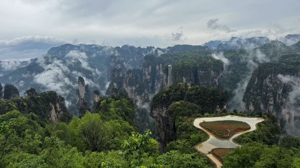 ▲ 스카이 가든은 장가계 국가삼림공원 내 천자산 올드 하우스 경관 지역에 위치해 있습니다. 해발 1,000m가 넘는 산 정상에 진주처럼 자리잡고 있으며, 계곡 건너편으로 원자제와 마주하고 있습니다. 이곳은 약 3헥타르 규모의 경사진 계단식 비옥한 땅으로, 전체 플랫폼에는 보호 장치가 전혀 없습니다. 플랫폼 바깥은 깊은 심연이며, 산들바람이 소매를 휘날리고 구름과 안개가 엉켜 있어 마치 신선의 세계에 있는 듯한 느낌을 줍니다. 이런 충격적인 장소는 평범한 곳에서는 느낄 수 없는 경험입니다.