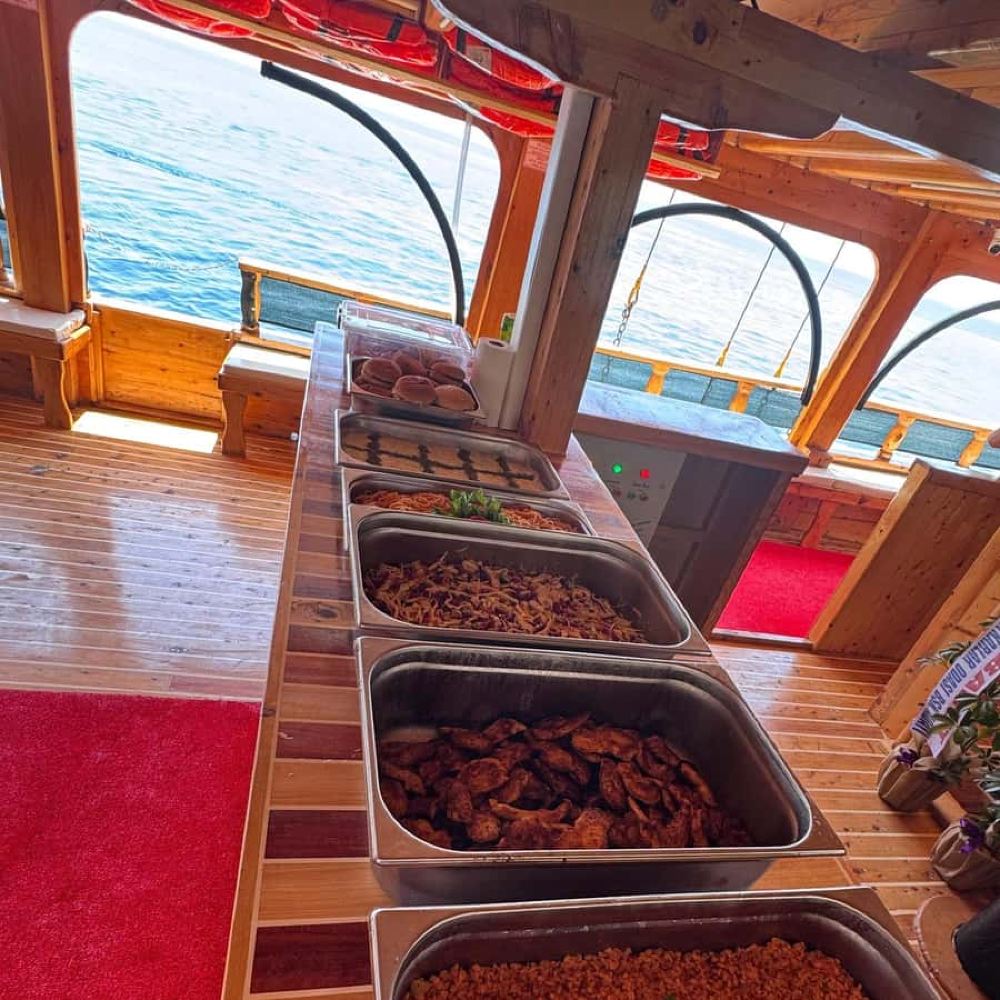 신선하게 준비된 다양한 요리를 배 위에서 경치와 함께 즐길 수 있습니다.