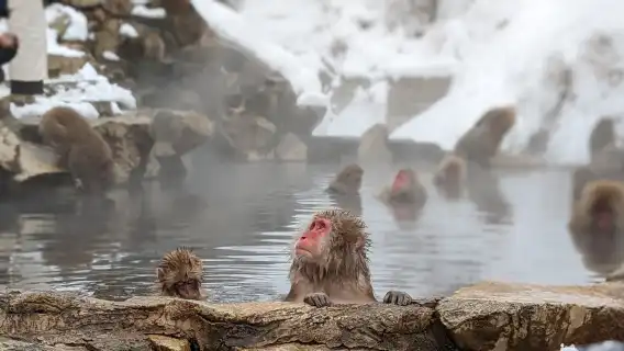 유명한 눈원숭이가 온천에서 목욕하는 모습을 감상하세요!