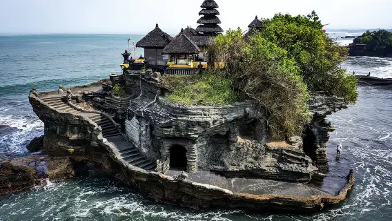 발리의 가장 상징적인 바다 사원 중 하나로, 바다의 바위 지형 위에 위엄 있게 우뚝 솟아 있습니다.