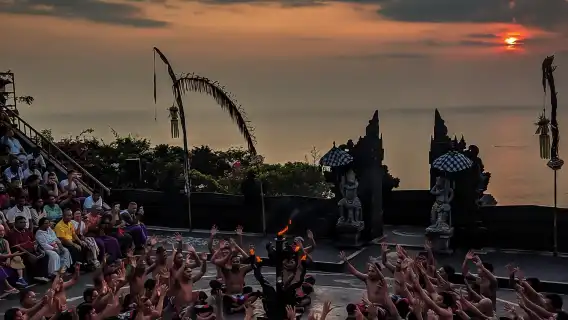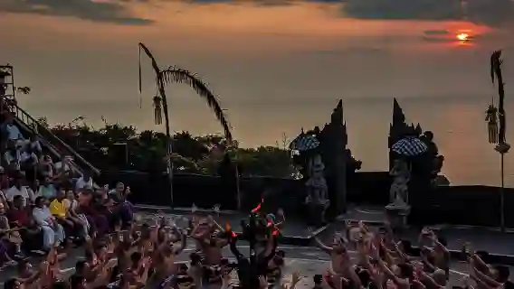매혹적인 케착 불춤을 경험해보세요. 리듬감 있는 움직임과 흥미로운 합창으로 서사시 라마야나를 재현하는 공연입니다.