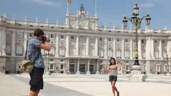 세계에서 가장 큰 왕궁인 마드리드 왕궁을 바라보세요