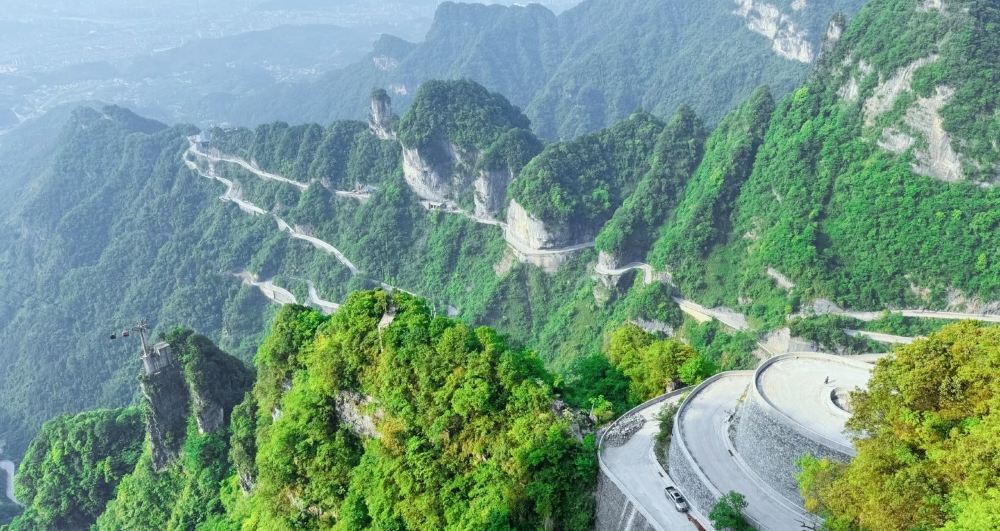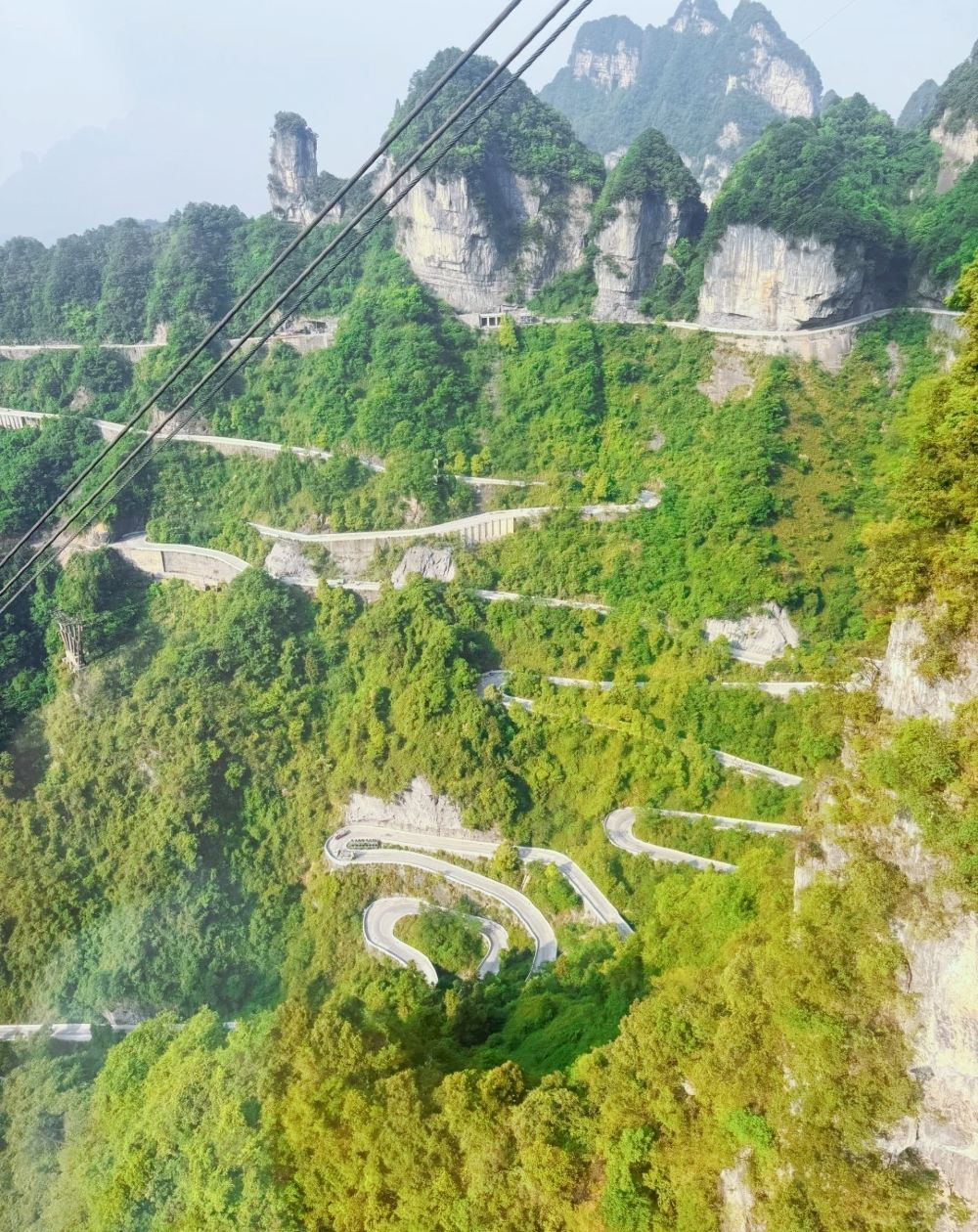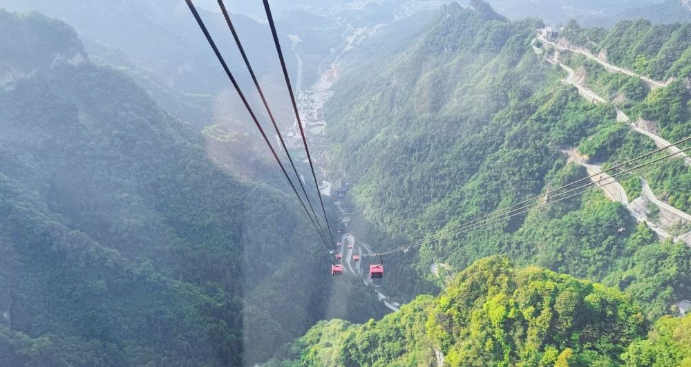 천문산의 세계에서 가장 긴 고산 케이블카를 타고 99개의 구불구불한 산악 도로를 내려다보며 약 30분 만에 정상에 도달하세요.