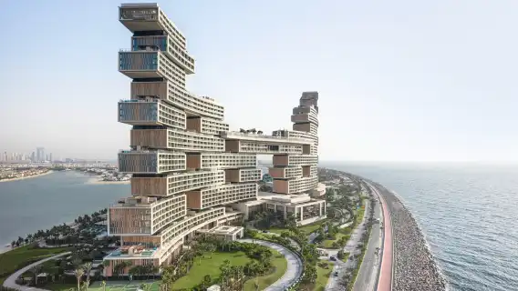 높이 솟은 돔 아래의 다이닝 공간으로 들어서면, 크리스탈 샹들리에에서 반사되는 따뜻한 조명과 발코니 밖 팜 아일랜드의 해안 풍경이 어우러져, 순간 왕실 급의 식사 분위기에 푹 빠져들게 됩니다.