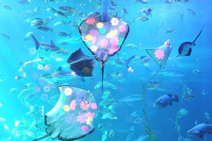 △ 메인 수조 식사시간. 아쿠아플라넷 제주의 초대형 메인수조, 제주의 바다에서는 바다 속을 멋지게 날아다니는 가오리들의 식사시간과 함께 재미있는 생태 이야기가 진행됩니다.