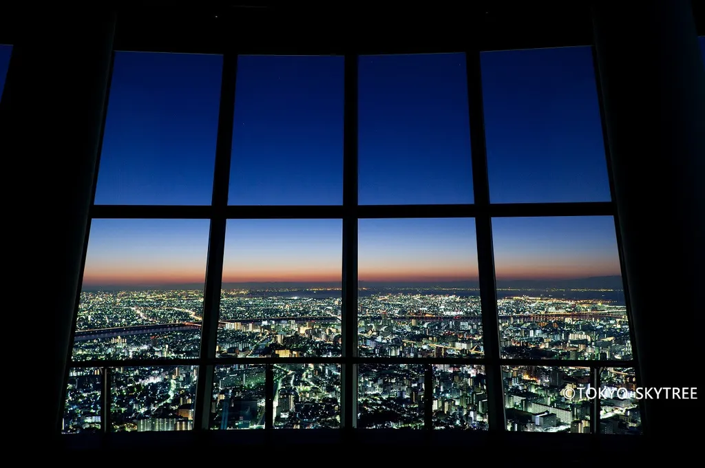 지면350m에 위치한 '도쿄 스카이트리 덴보 덱'는 높이 5m를 초과하는 대형 유리를 360도에 배치하고, 타워의 발밑에서약 70km 앞까지 바라볼 수 있는 개방적인 구조로 되어 있습니다.